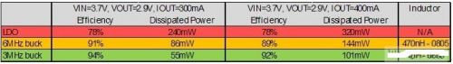 表1: LDO與 6MHz降壓轉(zhuǎn)換器和3MHz降壓轉(zhuǎn)換器的電源效率與功耗對(duì)比。