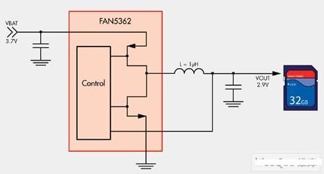 圖4:FAN5362降壓轉(zhuǎn)換器實(shí)現(xiàn)2.9V SD卡的供電電路。
