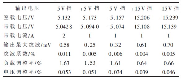 測(cè)試儀器采用固緯4 位半數(shù)字萬(wàn)用表(GDM-8245) 、上海愛(ài)儀交流毫伏表(AS2294D) 和調(diào)壓變壓器(TDGC -0.5/0.5) .負(fù)載電阻采用水泥電阻(2.5Ω/20 W、5Ω/20 W、15Ω/20 W) .電源性能參數(shù)如表1 所示。可以看出, 負(fù)載調(diào)整率和電壓調(diào)整率反映出了電源較高的穩(wěn)定度, 紋波系數(shù)指標(biāo)反映出低紋波特性。