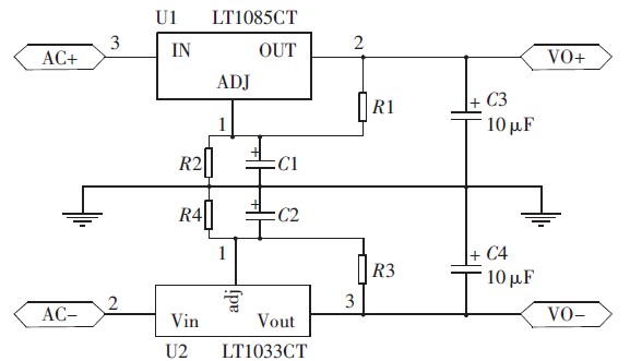 LT1083/LT1033 系列正負(fù)可調(diào)穩(wěn)壓器的效率大大高于現(xiàn)有器件,可以提供7.5 A、5 A 和3 A 輸出電流,并能在低至1 V 的壓差條件下運(yùn)行,壓降在最大電流條件下保證在1.5 V 以?xún)?nèi)。負(fù)載電流減小時(shí)允許壓差同時(shí)減小,可在多種電流水平條件下通過(guò)片內(nèi)修整電路,提供所保證的最小壓差,并能夠使輸出電壓準(zhǔn)確度調(diào)節(jié)至1%.其電壓調(diào)整率為0.015%,負(fù)載調(diào)整率為0.01%,對(duì)電流限值也進(jìn)行了修整,最大限度地減小了過(guò)載條件下穩(wěn)壓器和電源電路上承受的應(yīng)力,具有熱功耗限制保護(hù)[10].LT1083/LT1033 系列器件的引腳與老式三端穩(wěn)壓器兼容,與大多數(shù)穩(wěn)壓器設(shè)計(jì)中的10 μF 輸出電容器以及PNP 穩(wěn)壓器多達(dá)10%的輸出電流作為靜態(tài)電流消耗不同,LT1083/LT1033 系列的靜態(tài)電流流入負(fù)載, 大大降低了電源功耗。此芯片電壓調(diào)整率小、負(fù)載調(diào)整率小的特點(diǎn)能夠保證輸出電壓穩(wěn)定度高。正負(fù)線(xiàn)性穩(wěn)壓模塊電路如圖3 所示,其中R1=R3,R2=R4.電路中的電阻參數(shù)可根據(jù)輸出可調(diào)電壓公式確定: