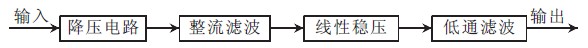 本設(shè)計(jì)由降壓模塊、整流濾波模塊、線(xiàn)性穩(wěn)壓模塊和低通濾波模塊組成, 如圖1 所示。變壓器將220 V/50 Hz 交流電分別降壓到±16 V、±6 V、+6 V, 通過(guò)整流橋堆整流以及大容量電容濾波后, 進(jìn)入正( 負(fù)) 線(xiàn)性穩(wěn)壓模塊, 再經(jīng)過(guò)低通濾波模塊濾除直流以外的干擾信號(hào), 分別輸出±15 V、±5 V、+5 V 的穩(wěn)定電壓。