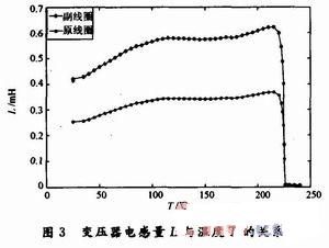 變壓器在中不僅能傳遞能量,同時還起到了電氣隔離的作用,變壓器的原邊與副邊線圈匝數(shù)比的不同可以達到升壓或降壓的作用。在模塊工作狀態(tài)下,由于磁芯的渦流效應(yīng),變壓器會產(chǎn)生很多的熱量,成為模塊熱量產(chǎn)生的主要來源。實驗中首先測試了變壓器原邊和副邊線圈的電感量隨溫度的變化,如圖3所示,從圖3中可見隨著溫度的升高,線圈的電感量先增加,然后小幅下降,再小幅上升,在環(huán)境溫度為220℃以前,變壓器的原邊與副本電感量的整體趨勢是逐漸增加,當溫度達到220℃,磁芯溫度達到居壁點,線圈的電感量迅速降為零。對于不同磁芯材料的變壓器其居里點溫度有所不同,對于此類變壓器,可知居里溫度在220℃附近。當變壓器溫度接近居里點時,變壓器電感量會迅速減小,會導致輸出電壓迅速下降。