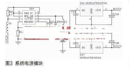 控制單元內(nèi)部單片機的供電為3.3V,其他芯片和模擬器件的供電在3V到10V之間。控制單元的電源輸入是由外部開關(guān)電源提供的。在生產(chǎn)現(xiàn)場,開關(guān)電源與水泵電機共用一路交流電,水泵在運行過程中會引起開關(guān)電源的輸出波動,若不采取防浪涌措施勢必會影響到單片機的正常工作。根據(jù)上述分析設(shè)計系統(tǒng)電源模塊如圖3所示。電感L1起防浪涌保護作用;輸入電壓經(jīng)開關(guān)電源芯片MC34063后輸出12V電壓,然后通過兩個NCP1117ST33穩(wěn)壓芯片產(chǎn)生兩路3.3V電源分別給單片機和光電接收電路供電。