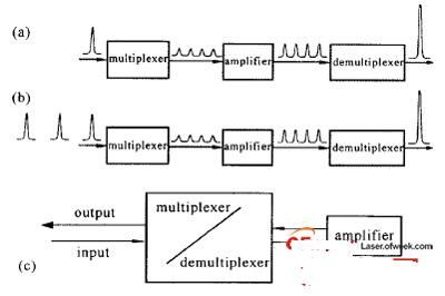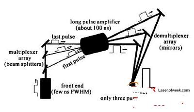 對(duì)于準(zhǔn)分子激光放大器,由于激活介質(zhì)的上能態(tài)儲(chǔ)能時(shí)間很短,必須連續(xù)補(bǔ)充瞬態(tài)儲(chǔ)能(Em)才能獲得高能輸出,即E=EmT/t,其中T是增益時(shí)間,t是增益恢復(fù)時(shí)間。對(duì)于電子束泵浦的準(zhǔn)分子激光放大器,增益時(shí)間可以長(zhǎng)達(dá)200ns,T/t≈100,這意味著對(duì)于單個(gè)要放大的短脈沖,只能提取出很小一部分能量。為了持續(xù)提取出放大器中的儲(chǔ)能,通常使用光學(xué)多路編碼技術(shù)。