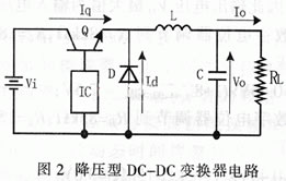 圖2所示為降壓型DC-DC變換器的典型電路,當(dāng)控制器IC感應(yīng)到輸出電壓Vo太低時,啟動通道上的晶體管Q給電感器L充電,同時也對電容器C充電,當(dāng)輸出電壓V0上升到一個預(yù)定值時,控制器關(guān)閉通道上的晶體管Q,電感器L和電容器C上獲取的能量通過肖特基二極管構(gòu)成的回路自由釋放,從電感器L到電容器C進(jìn)行有效的能量傳輸會消耗一部分能量,因此加載在負(fù)載上的電壓有所下降。