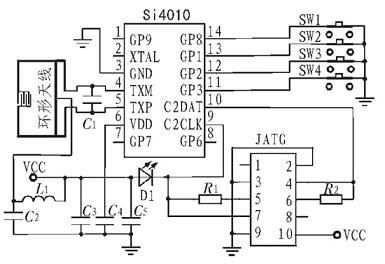 無線電發(fā)射系統(tǒng)是以Si4010 為核心來設計。Si4010 的4 個輸入輸出端口與按鍵直接相連,內部電路可直接采集按鍵狀態(tài)信息。Si4010 的信號差分輸出端TXM、TXP 分別與環(huán)形天線的兩端連接,環(huán)形天線直接印制在PCB 板上,減少了發(fā)射系統(tǒng)體積。采用C2 接口編程,Si4010 的C2DATA、C2CLK 端口與JTAG 接口的4 個端口相連。C3、C4、C5組成電源濾波電路。發(fā)光二極管提供按鍵動作指示,當有按鍵按下時,放光二極管亮,沒有按鍵按下,放光二極管滅。無線電發(fā)射系統(tǒng)的主要功能是在Si4010 內部MCU的控制下采集按鍵電路的狀態(tài)信息, 實現(xiàn)數(shù)據(jù)加密和編碼,再進行FSK 調制,調制后信號經(jīng)放大調諧,由環(huán)形天線發(fā)射出去。