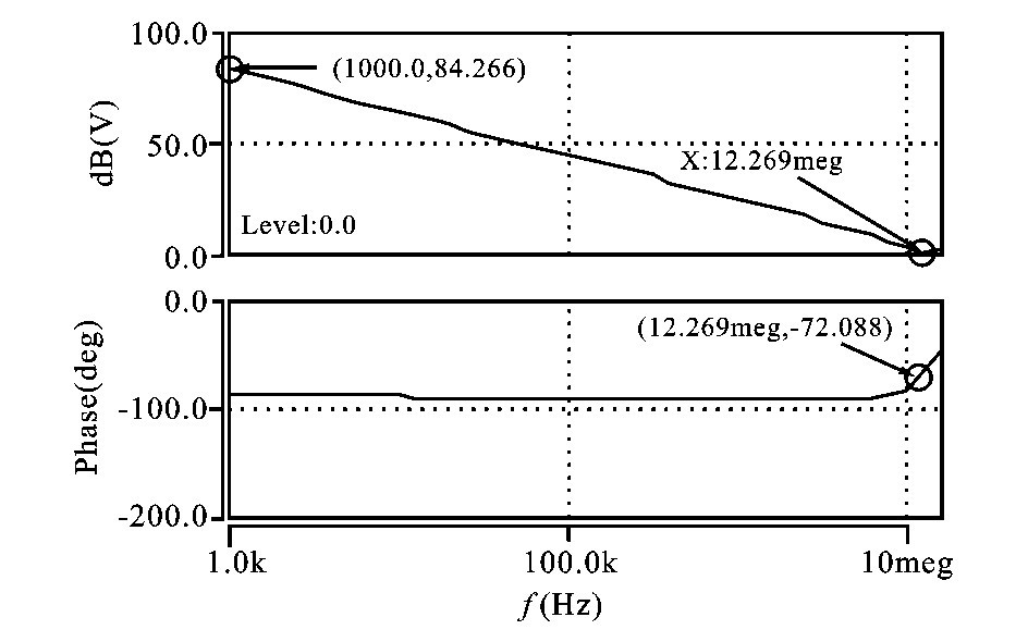 由運(yùn)放的頻率特性仿真圖5 可知,增益達(dá)到84. 266dB ,相位裕度108°,單位增益帶寬約12MHz ,滿足電路要求。