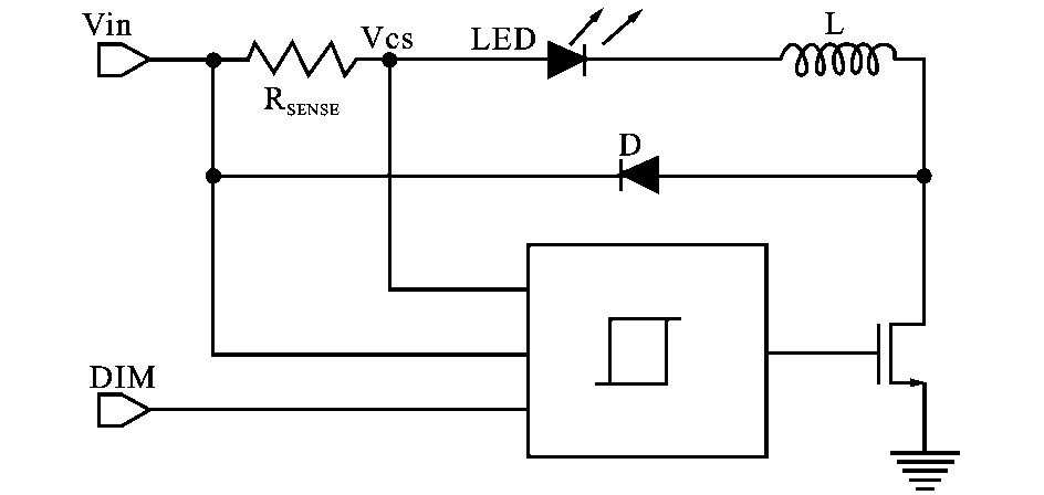 滯流控制模塊內(nèi)部電路如圖2 所示,當(dāng)DIM 信號(hào)為高電平期間,當(dāng)Vcs 大于上電壓閾值時(shí),控制電路輸出低電平,關(guān)閉功率開(kāi)關(guān)管。 由LED、電感L 、續(xù)流二極管D 和RSENSE組成的回路使得電感繼續(xù)為L(zhǎng) ED 提供電流,電感電流逐漸減小,使得檢測(cè)電壓Vcs 隨之減??;當(dāng)Vcs 小于下閾值電壓時(shí),控制電路輸出高電平,導(dǎo)通功率開(kāi)關(guān)管,此時(shí)D 截止,形成從電源經(jīng)RSENSE、L ED、L 和功率開(kāi)關(guān)管到地的回路,電源為電感L 充電,電感電流上升,檢測(cè)電壓Vcs隨之升高。 Vcs 大于上電壓閾值時(shí),控制電路關(guān)斷開(kāi)關(guān)管,重復(fù)上個(gè)周期的動(dòng)作,這樣就完成了對(duì)L ED驅(qū)動(dòng)電流的滯環(huán)電流控制,使得流過(guò)L ED 的驅(qū)動(dòng)電流,也就是電感電流的平均值恒定。