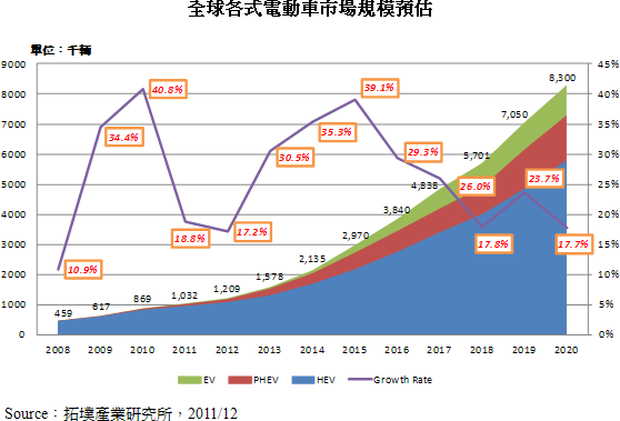 2020年前全球新能源車(chē)市場(chǎng)成長(zhǎng)動(dòng)能主要以油電混合車(chē)(Hybrid Electric Vehicle;HEV)為主,預(yù)計(jì)目前仍為全球電動(dòng)車(chē)銷(xiāo)售上升主力,約占整體電動(dòng)車(chē)市場(chǎng)70%。2011年后隨著鋰電池技術(shù)漸趨成熟,插電式油電混合車(chē)(Plug-in Hybrid Electric Vehicle;PHEV)市場(chǎng)逐漸起飛,2012年起將呈顯著成長(zhǎng),2020年銷(xiāo)售量將達(dá)150萬(wàn)輛,占整體電動(dòng)車(chē)市場(chǎng)的18%,而完全仰賴(lài)電池做為動(dòng)力來(lái)源的純電動(dòng)車(chē)(Battery only Electric Vehicle;BEV),由于各國(guó)政策推動(dòng)期程不一,現(xiàn)仍處于示范運(yùn)行階段,預(yù)計(jì)2020年占整體電動(dòng)車(chē)市場(chǎng)的12%。