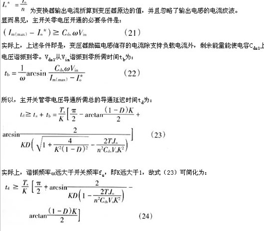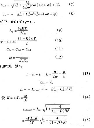 從上面的分析可明顯地看出,當(dāng)變壓器勵磁電感l(wèi)m減小,勵磁電流足夠大時(shí),[t5~t0′]期間勵磁電流除了能提供負(fù)載電流外,剩余部分可用來幫助電容cds2、cds1充放電。電壓vds1有可能諧振到零,從而實(shí)現(xiàn)主功率開關(guān)管s的零電壓軟開通。二極管d1可為負(fù)的勵磁電流續(xù)流。關(guān)鍵工作波形如圖2(b)所示,具體的軟開關(guān)條件將在下一節(jié)中詳細(xì)討論。很顯然,軟開關(guān)的代價(jià)是變壓器勵磁電流和開關(guān)管導(dǎo)通電流峰值大幅增加,開關(guān)管及變壓器電流應(yīng)力和通態(tài)損耗明顯加大。