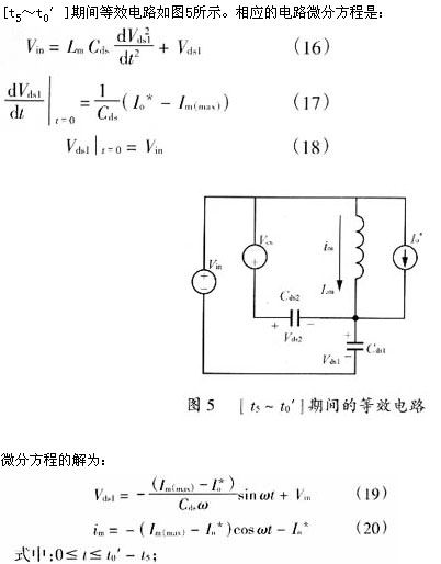 當(dāng)輔助開關(guān)sa斷開后,由于磁飽和電感l(wèi)s瞬間相當(dāng)于開路,因此變壓器勵磁電流可完全用來對cds2和cds1充放電。[t4~t5]、[t5~t0′]期間,等效電路同圖4。顯然,令式(21)和(24)中io*或io為零,即可得到主開關(guān)管零電壓導(dǎo)通的能量條件和時(shí)間條件,im(max)≥cdsωvin,即: