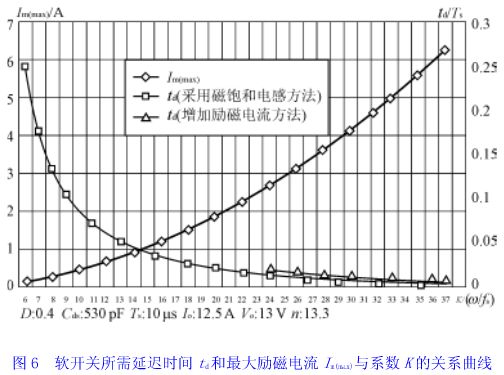 死區(qū)延遲時(shí)間,意味著pwm變換器有效占空比的損失。為了盡量減小有效占空比的損失,則k必須加大。另一方面,變換器開關(guān)頻率fs愈高,則為保持相同的有效占空比,k至少應(yīng)保持不變,即諧振頻率ω應(yīng)與開關(guān)頻率fs成比例增加。圖6給出了軟開關(guān)所需要的死區(qū)時(shí)間td和最大勵磁電流im(max)與k的關(guān)系曲線。從圖中明顯看出,采用加大勵磁電流的方法實(shí)現(xiàn)零電壓軟開關(guān)和采用磁飽和電感器比較,要求的k較大,因而有較大的勵磁電流損耗;另外,從式(15)看出,開關(guān)頻率愈高,電流峰值也愈高,變壓器的銅耗和開關(guān)管的導(dǎo)通損耗也愈大。因此,軟開關(guān)有源鉗位正激變換器工作頻率不宜太高。