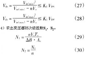 4)據(jù)式(29)、(30)求出變壓器初次級匝數(shù)n1,n2分別為40匝和3匝。