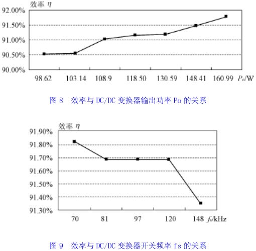 圖7(a)、7(b)、7(c)給出了實(shí)測的主開關(guān)管工作電壓、電流波形。圖7(a)顯示主開關(guān)管工作在硬開關(guān)狀態(tài)。圖7(b)和圖7(c)分別是采用增加勵磁電流方法和應(yīng)用磁飽和電感器方法實(shí)現(xiàn)零電壓軟開關(guān)的電壓電流波形,后者明顯地降低了勵磁電流和開關(guān)管電流的峰值。實(shí)測波形與理論分析完全一致。圖8、9顯示出了實(shí)測的效率曲線。從圖9中看出,當(dāng)變換器開關(guān)頻率增加時(shí),變壓器勵磁電流損耗和開關(guān)管通態(tài)損耗所占比重增加,變換器效率降低了。實(shí)驗(yàn)結(jié)果驗(yàn)證了理論分析。