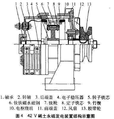目前稀土永磁材料已經(jīng)具備了較高的性價比,現(xiàn)代電力電子技術(shù)也為研制出斬波式的電子穩(wěn)壓器奠定了基礎(chǔ)。因此,利用稀土永磁材料和現(xiàn)代電力電子元件研制出結(jié)構(gòu)簡單、發(fā)電效率高、壽命長的42V稀土永磁發(fā)電機(jī)具有較高的研究價值和廣闊的推廣前景。