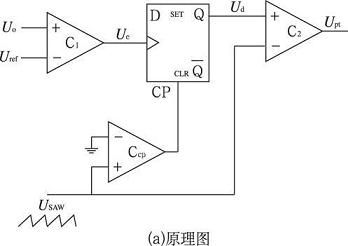 本節(jié)設(shè)計一種簡單實用的脈沖序列控制器, 如圖2 所示。圖2 中時鐘信號CP( Clock Pulse) 由峰峰值為- 10 V到+ 10 V 的鋸齒波信號USAW 與電壓信號UGN D ( UGND = 0) 通過比較器Ccp產(chǎn)生; 變換器輸出電壓Uo 與基準電壓Uref 通過比較器C1 產(chǎn)生電壓信號Ue;觸發(fā)器D 在時鐘來臨時刻將電壓信號Ue 傳遞至輸出端Q, 并在下一時鐘來臨之前保持不變; 比較器C2 將D 觸發(fā)器的輸出信號和鋸齒波進行比較產(chǎn)生控制脈沖PH 或PL 實現(xiàn)對變換器的控制。