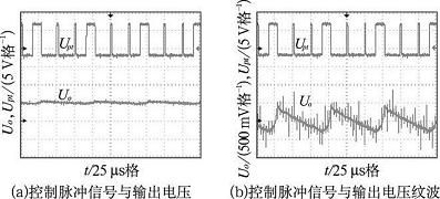 從圖4( a) 中, 可以看出當MOSFET 管導(dǎo)通控制信號為高能量脈沖占空比為DH 時, 輸出電壓Uo 有小幅上升;而MOSFET 管導(dǎo)通控制信號為低能量脈沖占空比為DL 時, 輸出電壓Uo 有小幅下降, 與仿真波形圖一致。在圖4( b) 中,可觀察輸出電壓Uo 的紋波圖, 能夠更清楚地反映開關(guān)管導(dǎo)通控制信號與輸出電壓的變化關(guān)系。從圖中,可以更加明顯看到開關(guān)管導(dǎo)通控制信號的變化對輸出電壓的影響, 與仿真結(jié)果基本一致。