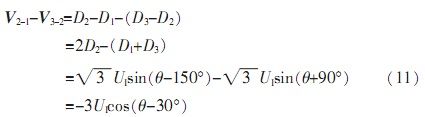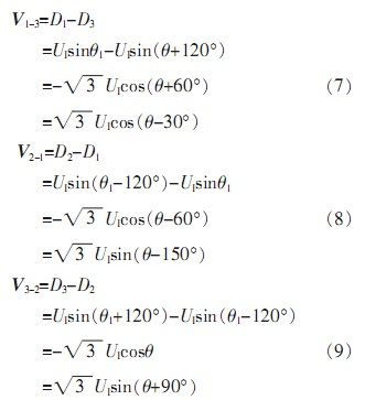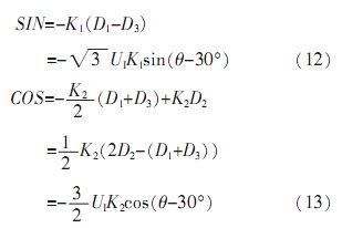 由于自整角機中定子繞組為星型連接,彼此在空間上呈120°,并且輸出三路定子繞組電壓D1、D2、D3是相對于中心點而言,無法對其單獨處理。由公式(5)可知,其任意兩線間電壓為: