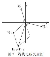 三路線線電壓在空間上的矢量圖如圖2所示。由圖2可知,三路線線電壓中任意兩路之差與第三路呈正交關(guān)系,若能提取出這樣的兩路正交信號,就能很好地解決芯片的輸入問題。對此作出如下推導(dǎo):