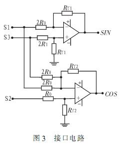 由于RD-19230芯片內(nèi)部處理信號為兩路正交信號,通常情況下可由旋轉(zhuǎn)變壓器直接提供,其正常工作情況下對兩路輸入信號電壓要求為2Vrms±15%,而自整角機輸出信號為三線壓值不定的信號,從而設(shè)計出簡單方便的轉(zhuǎn)換電路是有必要的。