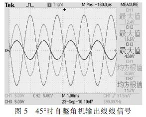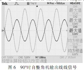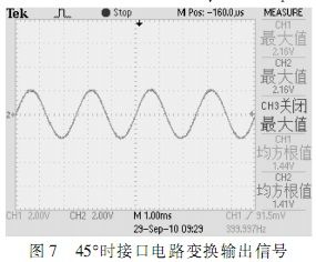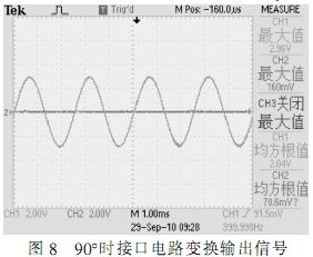 根據(jù)圖中所示,在確定的角度下,自整角機三路線線信號在電壓上呈120°正弦關(guān)系,接口電路轉(zhuǎn)換輸出信號為兩路電壓正交信號,根據(jù)角度不同,兩路信號電壓峰值不同,單路最大時電壓為2Vrms。測試結(jié)果完全符合設(shè)計要求。
