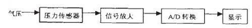 下面以測量輪胎氣壓為例詳細闡述氣壓傳感器在汽車輪胎方面的應用。此種設計可做成一種便攜式的裝置,測量時將氣壓傳感器的表置于輪胎氣門嘴上,這時胎壓作用于傳感器的膜片上,通過壓阻效應和系列變換輸出微弱的電壓信號,將電壓信號進行相應處理顯示電壓值。由此可知不同的氣壓對應著不同的電壓值,即氣壓值和電壓值是一一對應的,從而間接測量了氣壓值。胎壓測量電路方框圖如圖4所示。