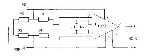 我們選用的高精度低噪聲儀用放大器AD620,可以用在傳感器輸出信號小的放大器中,如光電池傳感器、應變片傳感器以及壓力傳感器等。由于它具有低噪聲、增益精度高、增益溫度系數(shù)小和高線性度等優(yōu)良性能。用于此系統(tǒng)中是非常理想的。AD620是一種只用一個外部電阻就能設置放大倍數(shù)為1-1000的儀表放大器,具有良好的直流性能和交流性能,AD620的體積小、功耗低成為應用在壓力傳感器中的重要因素,傳感器信號放大電路如圖5所示。