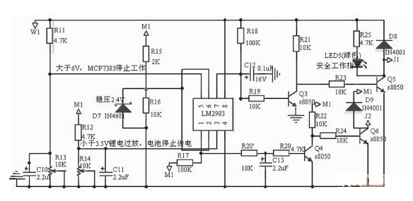 過電壓保護(hù)控制,具體電路如圖3所示:整流二極管D4 接過電壓保護(hù)繼電器JDQ1輸出。 充電控制管理芯片MCP73831最大輸入電壓為6V. 雖然供電網(wǎng)絡(luò)基本輸出電壓為5V,但當(dāng)光照強(qiáng)度發(fā)生劇烈變化或負(fù)載變化較大時,輸出電壓仍然會有一定波動,為保護(hù)MCP73831不因短時的電壓波動而損壞,設(shè)計了過電壓保護(hù)控制器。 當(dāng)W1 的電壓超過6V, JDQ 1會斷開輸出電路,MCP73831因斷電而得到保護(hù)。 具體分析如下:此部分電路設(shè)計主要采用了LM 2903電壓比較器和外圍電路擴(kuò)展而成。 LM 2903包含兩路比較器,1, 2, 3腳為一路, 1腳為OU TPU TA, 2, 3腳為IN PU TA. 5, 6, 7腳為另一路, 7腳為OU TPU TB, 5, 6腳為IN PU TB. 其中過電壓保護(hù)控制器用5, 6, 7腳的比較器。電阻R11 , R13分壓后接至比較器的5腳。 當(dāng)電壓大于6V 即分壓值大于214V. 比較器的7腳輸出電平由低轉(zhuǎn)為高。 Q3 飽和導(dǎo)通,則Q5 截止,安全工作指示燈熄滅,接點(diǎn)J1為高電平,此時JDQ 1開始工作,供電電路與后續(xù)電路斷開,同時過電壓紅色警示燈亮起。