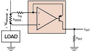 為了克服這些電流檢測難題,人們創(chuàng)造了高端電流檢測放大器。這些特殊放大器用來從高共模電壓中抽取通過小檢測電阻的電流產(chǎn)生的小差分電壓。然后,檢測電壓被放大并被轉(zhuǎn)換成以地為基準(zhǔn)的信號。圖 5 顯示了高端電流檢測放大器的基本拓?fù)?。在這個圖中,放大器給 RIN 加上等于 VSENSE 的電壓。然后,通過 RIN 的電流流過 ROUT,提供以地為基準(zhǔn)的輸出電壓。就這個基本功能而言,很明顯,高端電流檢測放大器應(yīng)該有高輸入阻抗、高增益和高增益準(zhǔn)確度、以及寬共模范圍和良好的共模抑制。也許不那么明顯的是還有放大器精確度的重要性。