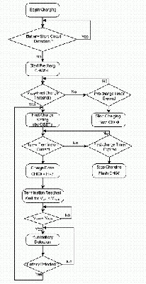 圖6所示為鋰離子電池充電器的標準充電流程,首先充電IC偵測是否有輸出短路或是過載的保護模式,若系統(tǒng)一切正常接著偵測電池初始電壓是否達到 3V以上,高于3V者就直接以快充模式進行高電流充電,若電池低于3V者,進入預(yù)充電模式,以快充的10%進行充電,喚醒電池并避免電池損壞。在預(yù)充電階段,仍隨時偵測電池電壓,達到3V后可隨即切入快充模式。