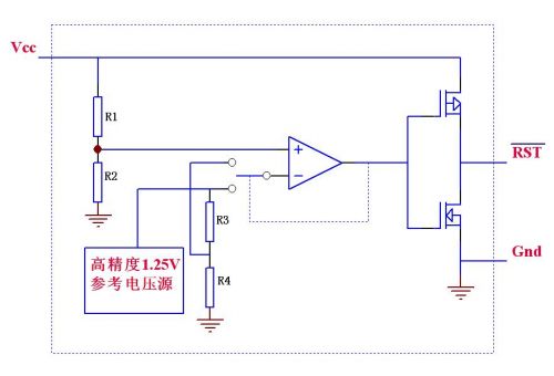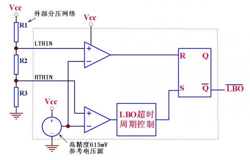 IC內(nèi)含一個(gè)高精度的615mV基準(zhǔn)電壓源、兩個(gè)比較器、一個(gè)RS觸發(fā)器和其它一些邏輯電路,其大致功能是:VCC電壓或其它待檢測(cè)電壓通過(guò)R1-R3組成的分壓網(wǎng)絡(luò)接在IC的LTHIN /HTHIN檢測(cè)引腳,當(dāng)待測(cè)電壓下降導(dǎo)致LTHIN引腳低于615mV時(shí),輸出腳LBO輸出低電平,而如果待測(cè)電壓上升導(dǎo)致HTHIN引腳高于615 mV時(shí),經(jīng)過(guò)內(nèi)部邏輯判斷和簡(jiǎn)單延時(shí)后,輸出腳LBO輸出高電平。
