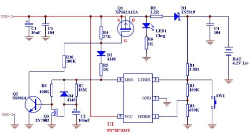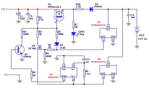 乍看之下,這個(gè)方案采用了三個(gè)IC,可是U1和U2是采用的SOT-23或者TO-92封裝,就好像普通三極管一樣,其價(jià)格也就是2-3個(gè)三極管的價(jià)格,而U3(PT8A2513NE)也是采用的TO-94封裝,外形和三極管很相似,價(jià)錢也相當(dāng)便宜,不過(guò),這個(gè)電路可以實(shí)現(xiàn)智能判斷電池是否過(guò)放電,決定是否在開(kāi)始充電時(shí)采用小電流預(yù)充,另外,采用U3后也將充電后期的補(bǔ)充充電過(guò)程延長(zhǎng)到大約一個(gè)小時(shí)!