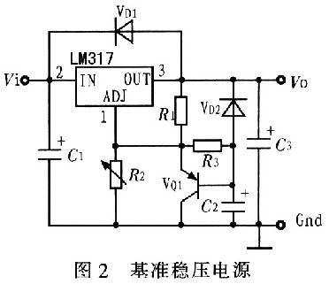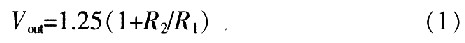 LM317是美國(guó)國(guó)家半導(dǎo)體公司的三端可調(diào)正穩(wěn)壓器集成電路,輸出電壓范圍是1.2~37 V,負(fù)載電流最大為1.5 A,使用簡(jiǎn)單。其工作過(guò)程如下:輸出電壓Vout通過(guò)R1、VQ1,對(duì)C2充電,開(kāi)始時(shí)VQ1飽和導(dǎo)通,Vout最低(約1.5 V)。隨著C2上電壓的升高,VQ1逐漸退出飽和并趨于截止,Vout逐漸升高至額定電壓。改變R1、C2的常數(shù)可改變軟啟動(dòng)的時(shí)間。改變可變電阻R2的值,可調(diào)整輸出電壓Vout的值。VD1用于關(guān)機(jī)后使C2上的電荷快速泄放。其輸出電壓為: