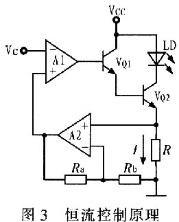 為了實(shí)現(xiàn)高的電流穩(wěn)定度,驅(qū)動(dòng)電路大多采用負(fù)反饋的控制方法,恒流控制原理如圖3所示。穩(wěn)流電路由基準(zhǔn)電壓電路、電壓-電流轉(zhuǎn)換電路、恒流輸出電路和反饋電路組成。電路工作時(shí),基準(zhǔn)電壓經(jīng)過(guò)適當(dāng)放大后送入運(yùn)放A1的同相端,運(yùn)放A1控制VQ1基極電流的大小,從而獲得相應(yīng)的輸出電流,輸出電流在取樣電阻R上產(chǎn)生取樣電壓,該取樣電壓經(jīng)A2放大后作為反饋電壓反饋回電壓放大器A1的反相輸入端,并與同相輸入端的電壓進(jìn)行比較,對(duì)輸出電壓進(jìn)行調(diào)整,進(jìn)而對(duì)VQ1基極的輸出電流進(jìn)行調(diào)整,使整個(gè)閉環(huán)反饋系統(tǒng)處于動(dòng)態(tài)的平衡中,以達(dá)到穩(wěn)定輸出電流的目的。