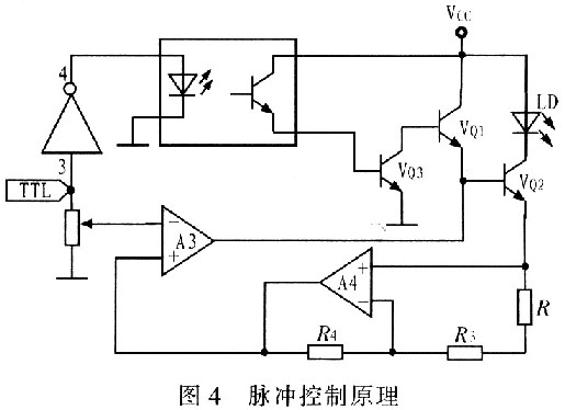 根據(jù)上述設(shè)計(jì)思想設(shè)計(jì)脈沖控制接口電路,其原理圖如圖4所示。由非門(mén)單元,晶體管VQ3,光電耦合器組成。當(dāng)脈沖為高電平時(shí),非門(mén)輸出低電壓,使光電耦合器截止,光電耦合器輸出低電平,使晶體管VQ3截止,VQ3集電極輸出高電平使VQ1、VQ2導(dǎo)通,LD正常工作;反之,光電耦合器導(dǎo)通,使VQ3導(dǎo)通,VQ3集電極輸出低電平,使VQl、VQ2截止,LD不工作。在沒(méi)有外控脈沖控制信號(hào)時(shí),接口懸空,非門(mén)輸入高電平,輸出低電壓,光電耦合器不工作,晶體管VQ3截止,VQ3集電極為高電平,使VQ1導(dǎo)通,保證LD的正常連續(xù)發(fā)光。