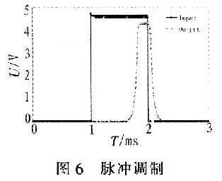圖6顯示了該驅(qū)動(dòng)電源輸出的脈沖波形。曲線Input為輸入控制脈沖信號(hào),曲線Output為L(zhǎng)D上電壓脈沖。結(jié)果表明:LD上電壓脈沖的上升和下降時(shí)間都很短,中間段電壓的穩(wěn)定使輸出電流恒定,恒定的電流幅度保證了LD輸出功率的穩(wěn)定。通過(guò)改變輸入脈沖的頻率、脈寬,可得到所需的LD激光脈沖信號(hào)。