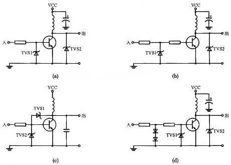 各種瞬變電壓能使晶體管的EB結(jié)或CE結(jié)擊穿而損壞,特別是晶體管集電極有感性(線圈、變壓器、電動機)負載時,通常會產(chǎn)生高壓反電勢,因而可能使晶體管損壞。在實際應用中,建議采用TVS作為保護器件。圖3所示為TVS保護晶體管的四種電路實例。