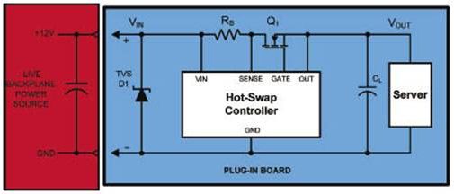 在熱插拔應用中,TVS主要用作需要被中斷的差模電流的接地分流路徑。熱插拔系統(tǒng)常被用在分布式電源系統(tǒng)中提供可靠的系統(tǒng)保護和電氣管理,典型服務(wù)器系統(tǒng)的線卡接口和熱插拔電路原理圖如圖5所示。