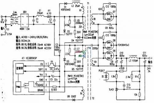整機(jī)電路見下圖。交流電源經(jīng)共模扼流圈Lcm后被BD1整流;L1和C1、C2組成竹型濾波(C1、C2的容量非常小,濾波后仍為脈動(dòng)波形);PT用于抑制浪涌電流。整流濾波后的脈動(dòng)直流電壓一路經(jīng)變壓器T1的初級(jí)繞組和二極管D3被IC1中的場效應(yīng)管開、關(guān)。從T1次級(jí)繞組經(jīng)D7輸出脈動(dòng)直流電壓。