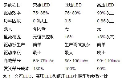 低壓LED驅(qū)動(dòng)電源是從開(kāi)光電源原邊反饋電路移植過(guò)來(lái)的產(chǎn)物,設(shè)計(jì)電路復(fù)雜,恒流精度誤差較大。小功率開(kāi)關(guān)電源驅(qū)動(dòng)方式驅(qū)動(dòng)效率充其量設(shè)計(jì)到80%,LED應(yīng)用開(kāi)始要求功率因數(shù),小功率電源并不具備。器件壽命受到限制,內(nèi)置電源體積也受限,市場(chǎng)機(jī)會(huì)因此受到局限。 高壓LED是因上述問(wèn)題而誕生的產(chǎn)物,集交流LED和低壓LED之優(yōu)點(diǎn),驅(qū)動(dòng)效率及恒流精度大大提升,各項(xiàng)參數(shù)均優(yōu)秀,性能價(jià)格比高。