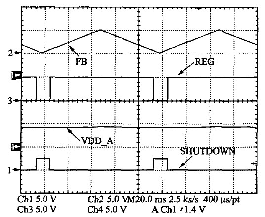 系統(tǒng)的多模式控制測(cè)試結(jié)果見圖13。中載或重載下系統(tǒng)采用PWM 模式工作,許多單元的供電電源為REG=5 V.極輕載條件下則關(guān)斷5 V的供電電源,減小系統(tǒng)的待機(jī)功耗,同時(shí)也有利于減小EMI和噪聲。其過程如下:當(dāng)FB電壓低于一個(gè)閾值時(shí),待機(jī)模式選擇,則SHUTDOWN信號(hào)變高,關(guān)斷5 V 電壓源REG模塊,同時(shí)VDD-AD繼續(xù)給芯片供電,保證在輕載時(shí)芯片的檢測(cè)能夠連續(xù)實(shí)現(xiàn)。