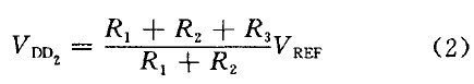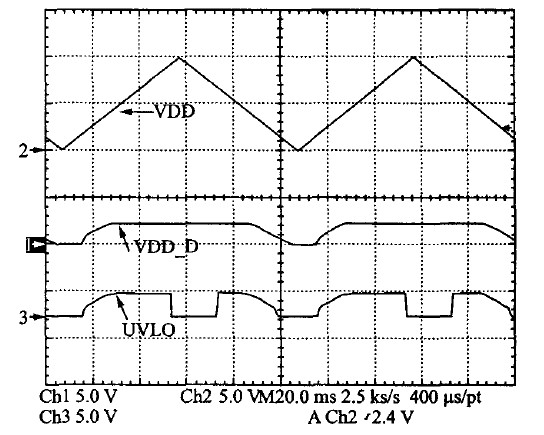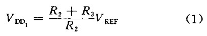 時(shí),比較器跳轉(zhuǎn),N1開通,UVLO-out開始變l.通過合理設(shè)置R1、R2、R3值就可以使VDD1=9.5 V,VDD2=7V,即VDD上升到9.5 V時(shí)UVLO輸出為零,芯片正常工作; VDD下降到7 V 時(shí)芯片停止工作。