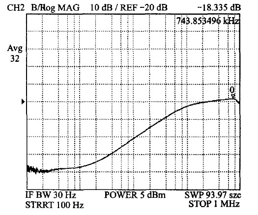 5 V 電壓的PSR測(cè)試波形如圖10所示。由此圖可見,其PSR可以達(dá)到-60 dB.該供電模塊在工作頻率為40~130 kHz的綠色多模式反激式控制器中的應(yīng)用表明,它對(duì)來自電源的干擾具有較好的抑制能力。