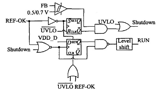 模式控制邏輯用以保證在進(jìn)行模式選擇時(shí),電源系統(tǒng)正常工作。當(dāng)FB電壓底于0.5 V時(shí),該控制邏輯通過內(nèi)部電流滯回比較器自動(dòng)選擇進(jìn)入待機(jī)模式。RUN信號(hào)(其為高電位有效)用來關(guān)斷綠色多模式反激變換器中的其它控制模塊,以實(shí)現(xiàn)低待機(jī)功耗。