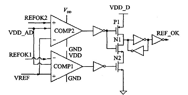 此外,本設(shè)計(jì)中還設(shè)置了一個(gè)REF-OK模塊來判斷上電后電源系統(tǒng)是否已進(jìn)入正常工作狀態(tài)。