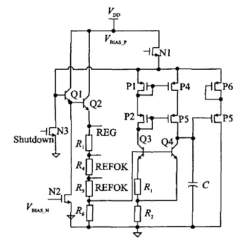 穩(wěn)壓機(jī)理如下:當(dāng)負(fù)載增加時(shí),REG電壓下降,則Q4基極下降,集電極升高,經(jīng)過P5、P6,使得Q1、Q2基極升高,REG 電壓升高;反之亦然。
