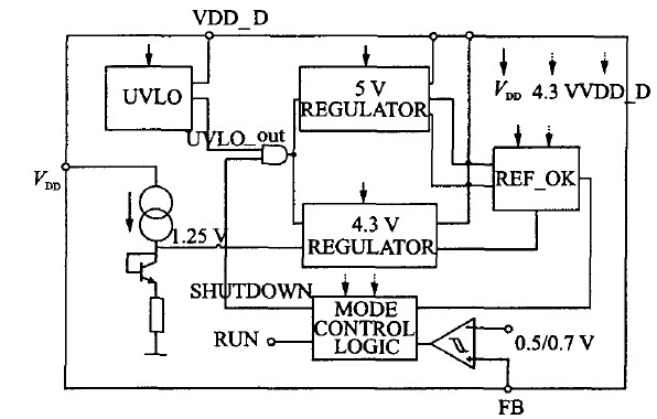 4.3 V 的穩(wěn)定電壓源(VDD-AD)用來在輕載時(shí)為系統(tǒng)供電,始終保持工作,在BURST模式下由它為模擬模塊供電。