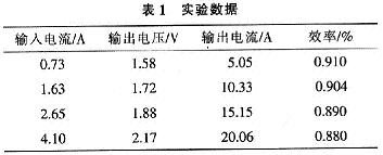 實驗中用50 A的2個二極管串聯(lián)作為負載,輸入電壓12 V時,不同電流下輸出及效率如表1所示。