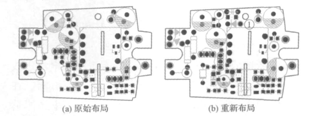 從圖4中可以看出在2 MH z頻率點(diǎn)附近最大超出為5 dBuV.為保證能夠順利通過(guò)認(rèn)證機(jī)構(gòu)的實(shí)驗(yàn)室測(cè)試, 一般要求預(yù)測(cè)試結(jié)果比標(biāo)準(zhǔn)限制低2 dBuV,希望盡量能夠比標(biāo)準(zhǔn)限值低6 dBuV.所以從圖4可知該產(chǎn)品的預(yù)測(cè)試結(jié)果并不理想。初步分析測(cè)試圖,可能性最大的原因是開(kāi)關(guān)管工作時(shí)產(chǎn)生的干擾把2MH z頻率點(diǎn)附近的噪聲電平底部懸空, 從而把傳導(dǎo)干擾的電平抬高。而在傳導(dǎo)發(fā)射測(cè)試中, 1 MH z~2MH z的頻率信號(hào)干擾是由共模電流產(chǎn)生的占主要分量[ 10] .所以初步定性為電流回路對(duì)參考地形成的干擾信號(hào)。為了能夠一次性解決問(wèn)題以達(dá)到標(biāo)準(zhǔn)限值要求, 把可能出現(xiàn)問(wèn)題的地方都加以改進(jìn), 本研究提出了解決方案: ①按照上述措施對(duì)線路板進(jìn)行重新布局, 原始布局如圖5( a)所示, 圖中布局雖然按照主電流流向排布, 但缺乏考慮各個(gè)子路之間的相互關(guān)系。重新布局如圖5( b)所示, 在無(wú)法改變PCB板的結(jié)構(gòu)下, 盡可能地將器件排列整齊, 方向一致, 同時(shí)增大開(kāi)關(guān)管與變壓器之間距離。② 變壓器初級(jí)增加并聯(lián)旁路濾波電容, 并聯(lián)電容值為1 000 pF /1 kV, 用來(lái)降低干擾信號(hào)對(duì)共模電流回路產(chǎn)生的影響。