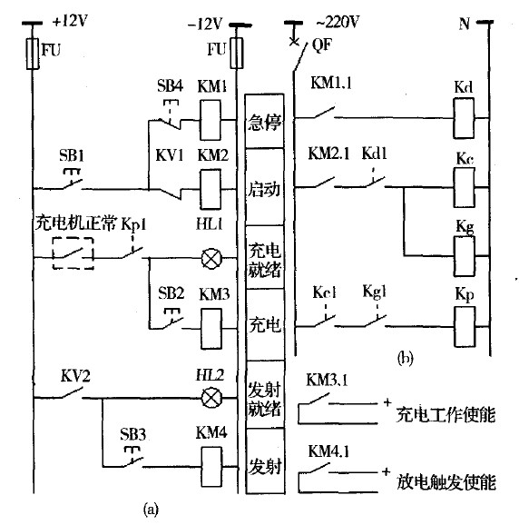 圖3(a)中,KM1-4為SSR,SB1-4為自鎖按鈕。系統(tǒng)上電后,通過(guò)按鈕SB1啟動(dòng)KM1和KM2,這樣Kd將首先得電動(dòng)作,隨后Kc、Kg、Kp也相繼動(dòng)作,為下一步進(jìn)行的充電工作做好了準(zhǔn)備。圖3(b)中,Kc和Kg啟動(dòng)采用了位置接點(diǎn)Kdl,同樣Kp啟動(dòng)也采用了位置接點(diǎn)Kcl和Kgl,這樣設(shè)計(jì)目的是使控制電路具有了邏輯動(dòng)作與防誤閉鎖功能。此時(shí)只要充電設(shè)備自檢正常(圖3(a)中"充電機(jī)正常"接點(diǎn)閉合),則燈HI 1指示可以進(jìn)行充電,通過(guò)按鈕SB2啟動(dòng)KM3便可對(duì)脈沖電容器組進(jìn)行充電。脈沖電容器電壓達(dá)到預(yù)設(shè)值后,KV動(dòng)作,常閉接點(diǎn)KV1斷開致使KM2失電,則Kc、Kg、Kp相繼返回,同時(shí)Kp返回又使KM3失電,這樣Kc、Kg斷開,充電機(jī)停止工作,滿足了系統(tǒng)放電前提。此時(shí)燈HL1熄滅、KV2接通,燈HL2指示充電完畢,通過(guò)按鈕SB3啟動(dòng)KM4則可進(jìn)行ETCG發(fā)射。